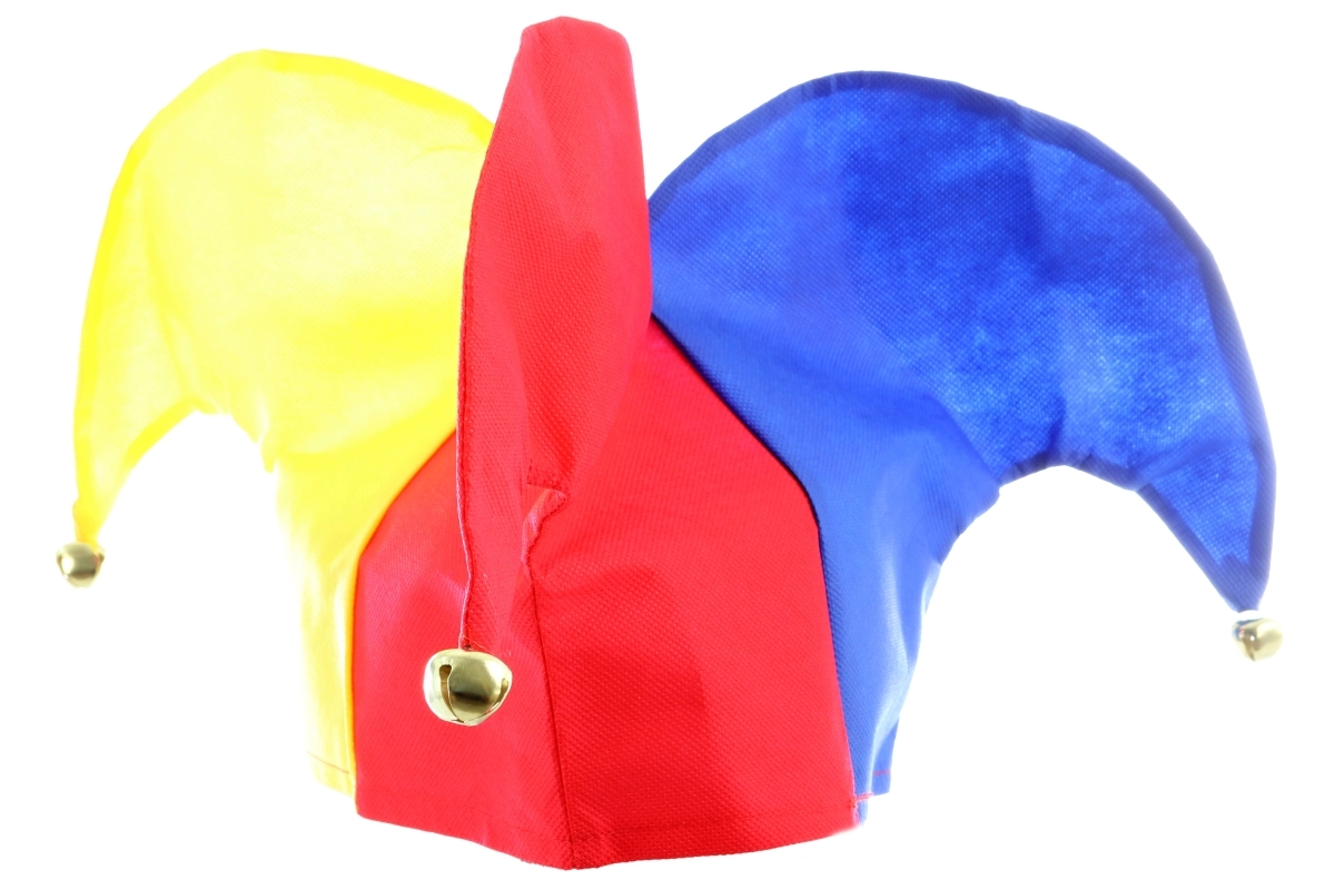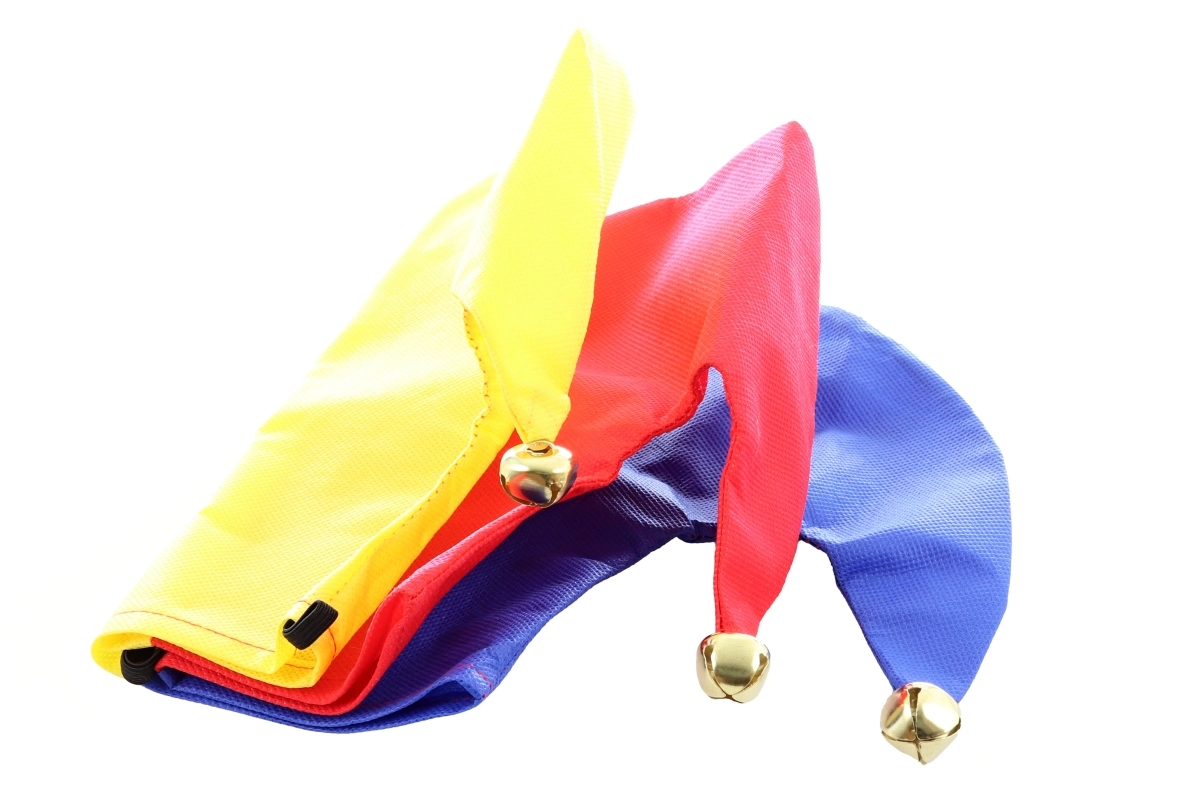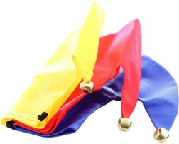 Kleurige clowns-hoed in geel, rood en blauw met metalen belletjes voor een speels effect bij elke beweging.
