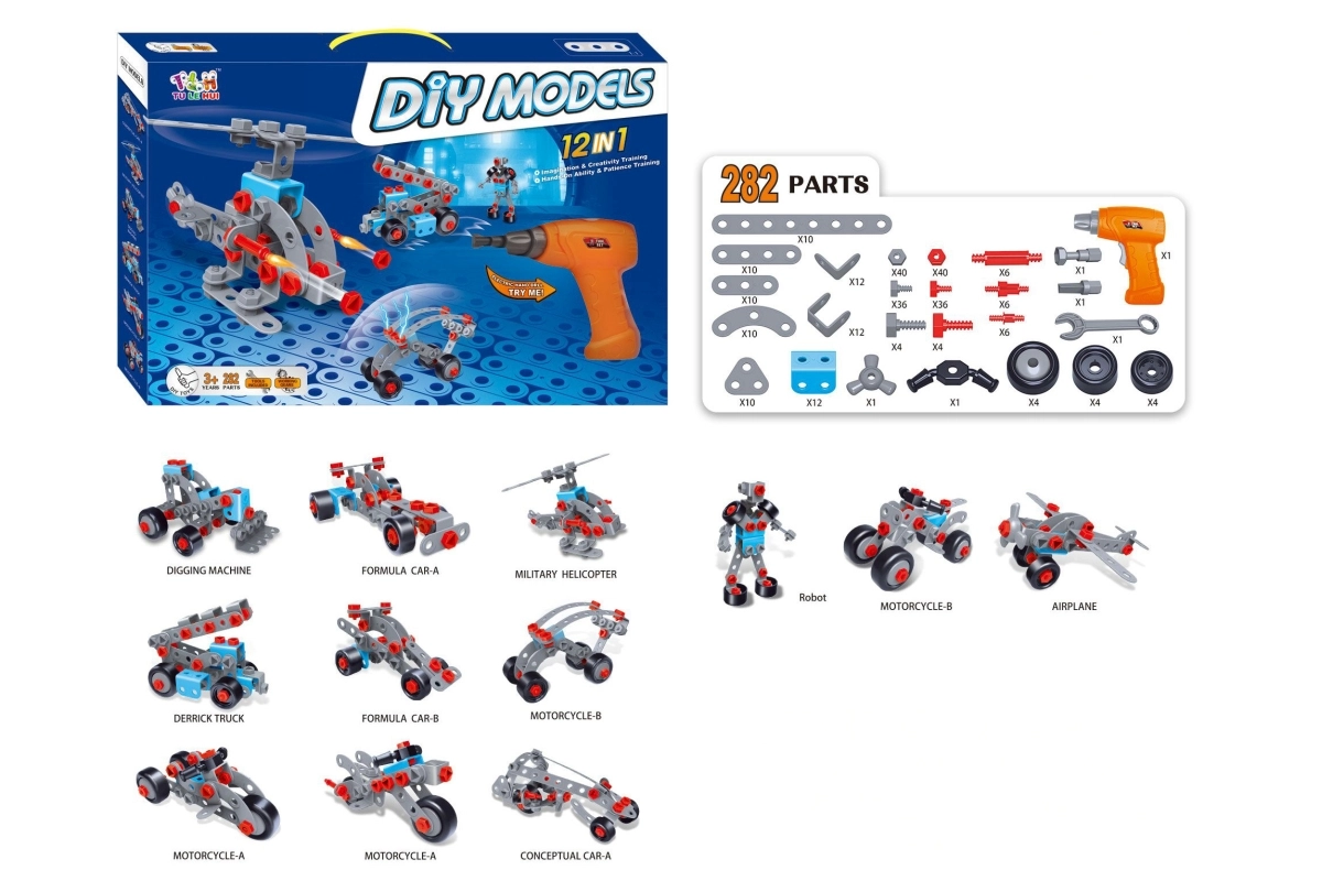 • Rijke uitrusting: 282 stukjes, kinderboormachine, schroevendraaier, handleiding