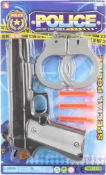 De politieset bevat een pistool, handboeien en 3 zuignapkogels. Afmetingen van de verpakking ca. 31,5 x 19 x 3 cm. Leeftijd 3+