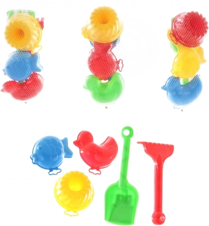 Leuke zandset voor kleine bouwers met een schep, harkje en drie vormpjes. Licht, makkelijk mee te nemen en verpakt in een netje – ideaal voor de speeltuin en het strand.