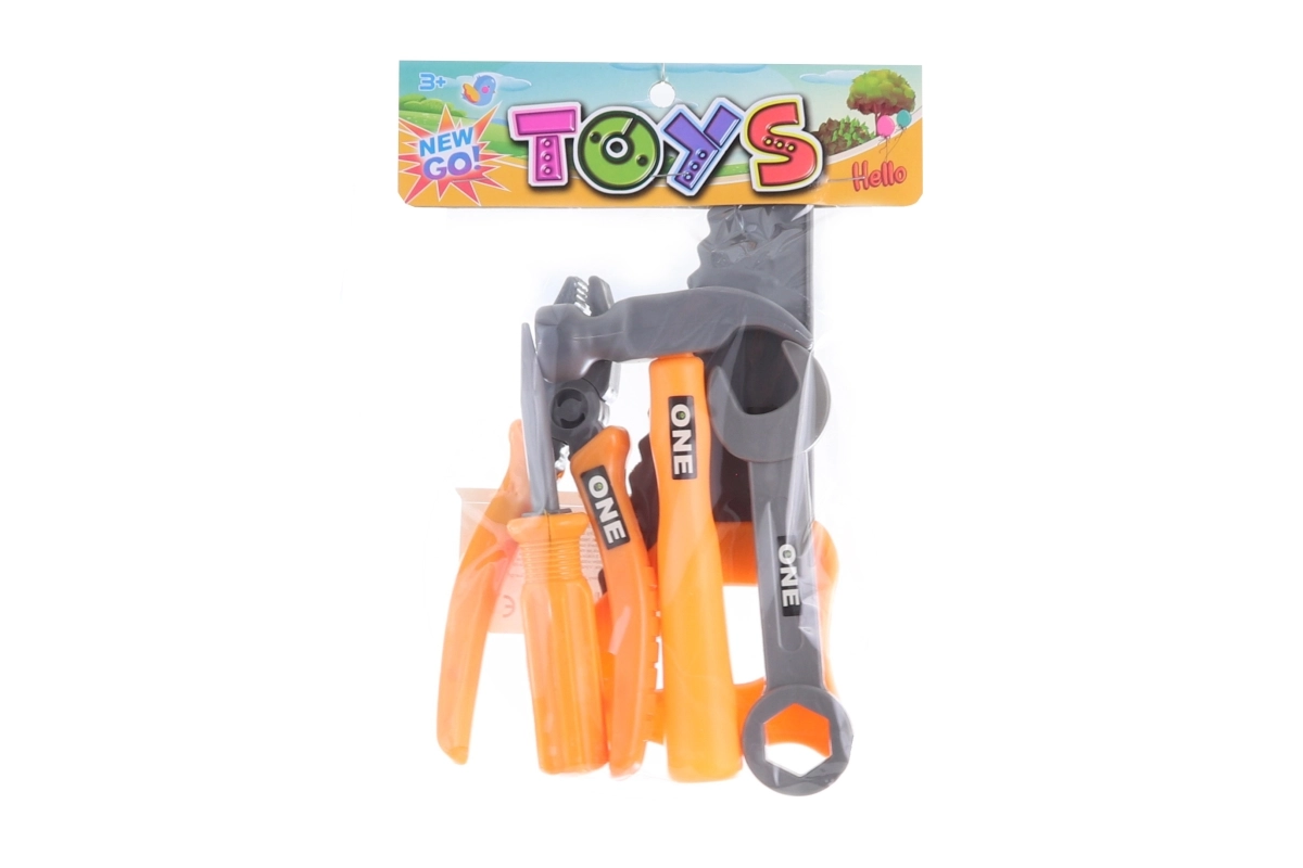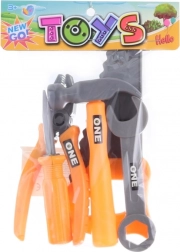 De set omvat vijf populaire tools – hamer, sleutel, schroevendraaier, tang en zaagje – die zijn aangepast aan kinderhanden. De verpakking met afmetingen ca. 16 × 22 × 4 cm is gemakkelijk op te bergen en mee te nemen.