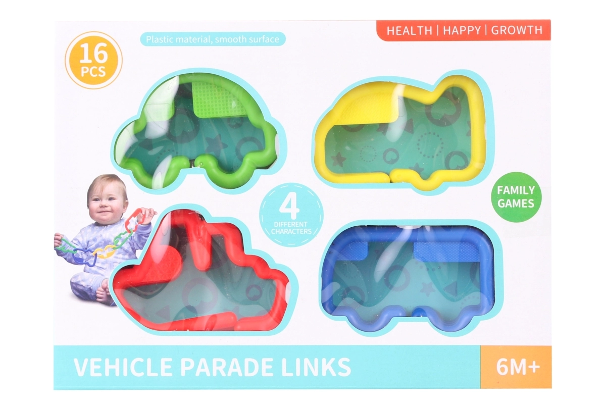 Ontdek een leuk en praktisch accessoire voor de allerkleinsten – een koppelketting met het thema vervoermiddelen. Dankzij de lichte kunststof schakels is hij eenvoudig te bevestigen aan de kinderwagen, het ledikant of het autostoeltje en biedt hij je kind veilige speelpret thuis en onderweg. Contrasterende kleuren en verschillende vormen stimuleren zien, voelen en de oog-handcoördinatie.
