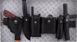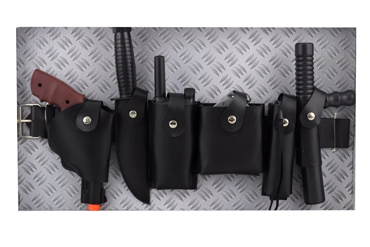- Leren riem (ca. 43 cm), pistool, mes, portofoon, handboeien, zaklamp op batterijen, wapenstok