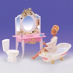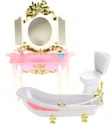 De stijlvolle Glorie badkamerset verandert de poppenkamer in een moderne wellnesszone. Bevat een kaptafel met wastafel, een bad en een wc, allemaal van duurzaam plastic. Ideale aanvulling voor creatieve spelletjes voor kinderen vanaf 3 jaar. Hoogwaardige afwerking, realistische details en complete badkameruitrusting stimuleren de fantasie en de fijne motoriek.