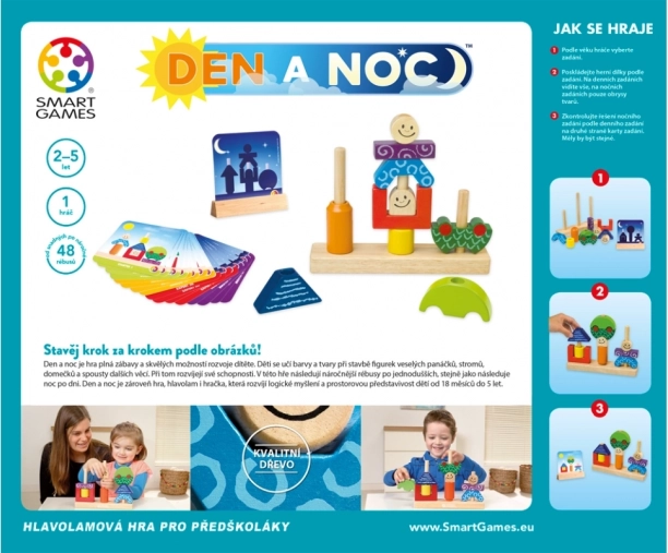 Dag en nacht is een slim ontworpen logisch spel voor één speler, dat kinderen meeneemt van de eerste eenvoudige bouwvoorbeelden tot meer veeleisende ruimtelijke taken. Op de dagkaarten zijn alle details zichtbaar, terwijl de nachtkaarten alleen silhouetten tonen – zo traint het kind verbeeldingskracht, aandacht en fijne motoriek.
