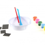 Gips, kunststof kom, kunststof mal met 6 motieven, 6 verfjes, kwastje, magneten, handleiding