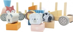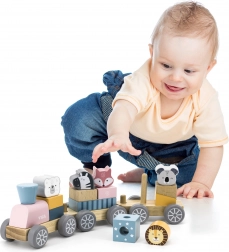 De trein is ontworpen om de creativiteit van kinderen en de coördinatie van fijne motoriek te bevorderen door het stapelen van blokken en dierfiguurtjes.