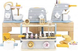 Alles wat je nodig hebt voor de eerste receptjes is inbegrepen: twee pannen en basisgerei (mes, lepel, spatel, tang), spiesen voor spiesjes en houten etenswaren zoals vlees, eieren en groenten. De kleurrijke uitvoering nodigt uit tot spelen en ondersteunt de rol van de kleine kok.