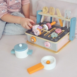 Twee pannen, een mes, lepel, spatel, tang, spiesen voor spiesjes en houten etenswaren (vlees, eieren, groenten) stimuleren fantasierijk rollenspel zonder extra aankopen.