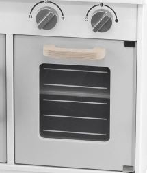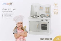 De stijlvolle houten keuken POLARB in grijze uitvoering verandert de kinderkamer in een klein culinair studio. Hij heeft een uitneembare spoelbak, een oven en een kookplaat en wordt geleverd met veel accessoires voor realistisch speelplezier. Draaibare schakelaars met klikgeluid, een duidelijke keukentimer en een kast voor het opbergen van servies stimuleren zelfstandigheid, creativiteit en spelenderwijs leren.