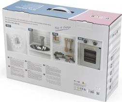 De set bevat een uitgebreide verzameling accessoires: een pan met deksel, een koekenpan met spiegelei, een lepel, een geperforeerde spatel, een pannenlikker en een zout- en peperstrooier. De draaibare 4 knoppen met klikgeluid en de overzichtelijke bel-timer geven het spel een realistische touch. De onderkast dient als opbergruimte voor etenswaren en servies en leert kinderen netjes opruimen.