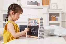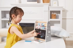 Inclusief een klein bord en stofvrij krijt voor het schrijven van cijfers, eerste sommen en eigen tekeningen – ideaal voor het ontwikkelen van creativiteit.