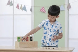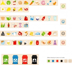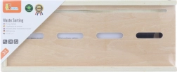 Het speelgoed leert kinderen op speelse wijze afval correct te scheiden met behulp van houten kaartjes en kleurgecodeerde bakken.
