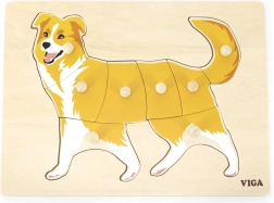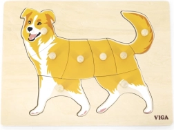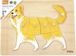 Eerste puzzel voor kinderen vanaf 18 maanden: houten Montessori-inlegpuzzel met hondmotief van VIGA. Dankzij de knopjes liggen de stukjes goed in de hand en stimuleren ze de fijne motoriek, oog-handcoördinatie en logisch denken. Duurzaam hout en veilige verven. Bordformaat 30 × 22,5 cm.