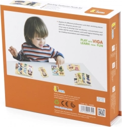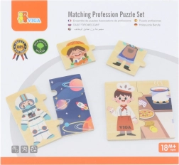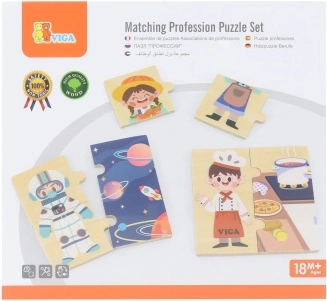 Het didactische houten spel van VIGA laat kinderen op een speelse manier kennismaken met verschillende beroepen – van arts en brandweerman tot kok of astronaut. Elk beroep bestaat uit drie delen: twee voor het personage en één groter voor de werkplek. Kinderen koppelen eerst het juiste duo en verbinden dit vervolgens met de omgeving.