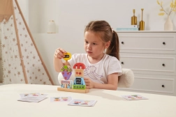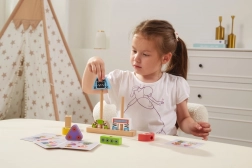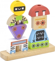 Ontdek een slimme speelgoedset die met kinderen meegroeit. Houten stukken in verschillende vormen en kleuren schuiven eenvoudig op de pinnetjes van de basis en maken het mogelijk verschillende robotfiguren te bouwen. De bijgevoegde voorbeeldkaarten leiden van eenvoudige naar complexere combinaties en ontwikkelen concentratie en geduld.