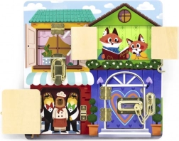 Houten Montessori activiteitenbord huisje met sloten en grendels