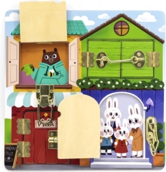 Ontdek een speels en leerzaam speelgoed voor de allerkleinsten: een houten activiteitenbord in de vorm van een huisje met vier verschillende sloten en grendels. Het stimuleert fijne motoriek, coördinatie en logisch denken dankzij het leuke openen van de deurtjes met dieren erachter. De kleurrijke uitvoering nodigt uit tot ontdekken en biedt elke dag zinvol spel.