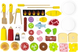 Groenten, vlees, kruiden, borden, bestek, tang en spiesstokjes – alles wat kinderen nodig hebben om burgers, spiesen en sandwiches te bereiden.