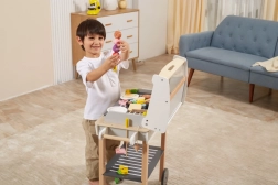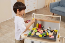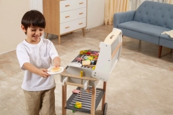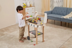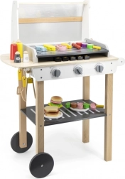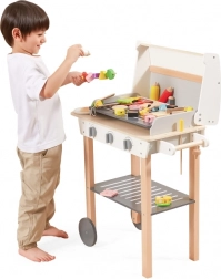 De VIGA kindergrill biedt een authentieke grillervaring in een veilige, hoogwaardige en stabiele houten constructie. Kinderen kunnen spiesen, burgers, hotdogs of sandwiches bereiden en “gasten” bedienen alsof het een echte tuinparty is. Draaiknoppen met klikeffect, een afneembare deksel en een uitschuifbaar rooster ondersteunen realistisch spel en de ontwikkeling van vaardigheid.