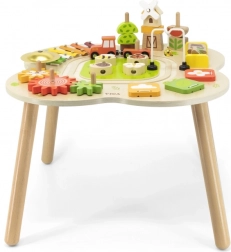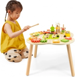 De tafel is afgewerkt met veilige, niet-giftige verven in levendige tinten die kinderen op natuurlijke wijze motiveren om te ontdekken. De rijke uitrusting – van tandwielen en xylofoon tot belletje, slimme puzzels en de treinbaan – garandeert urenlang zinvol plezier in de geest van Montessori.