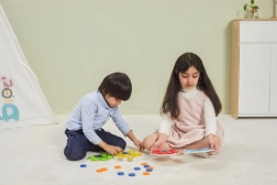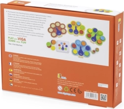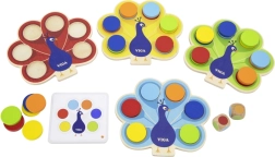 Kinderen plaatsen schijfjes volgens de kaarten of de dobbelsteenworp, waardoor ze op natuurlijke wijze kleuren aanleren en aandacht en logica trainen.