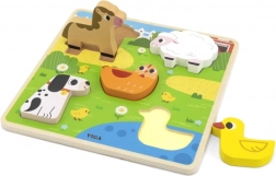 Deze schattige houten puzzel met boerderijthema bevat 5 robuuste stukjes – een paardje, schaapje, kip, hondje en eendje. Kinderen plaatsen de dieren in de overeenkomstige openingen op de kleurrijke ondergrond, waarmee ze vormherkenning en visueel geheugen trainen.