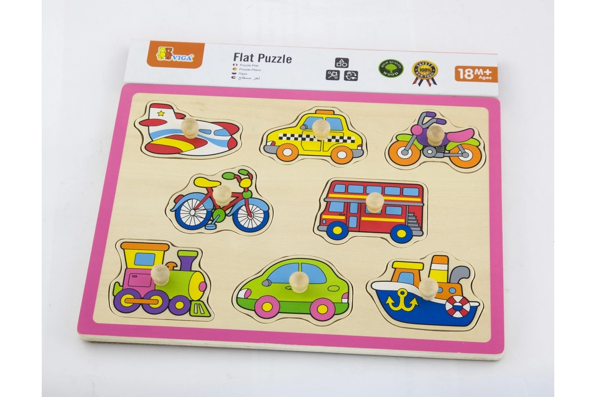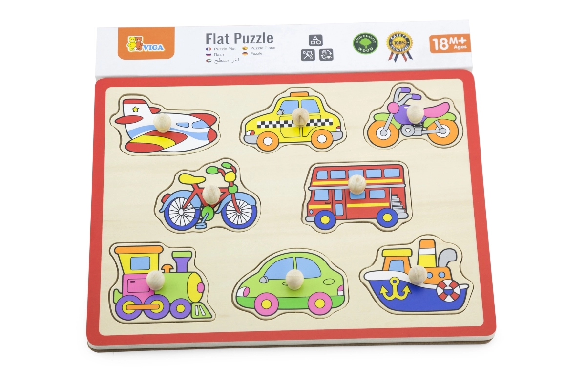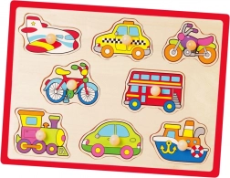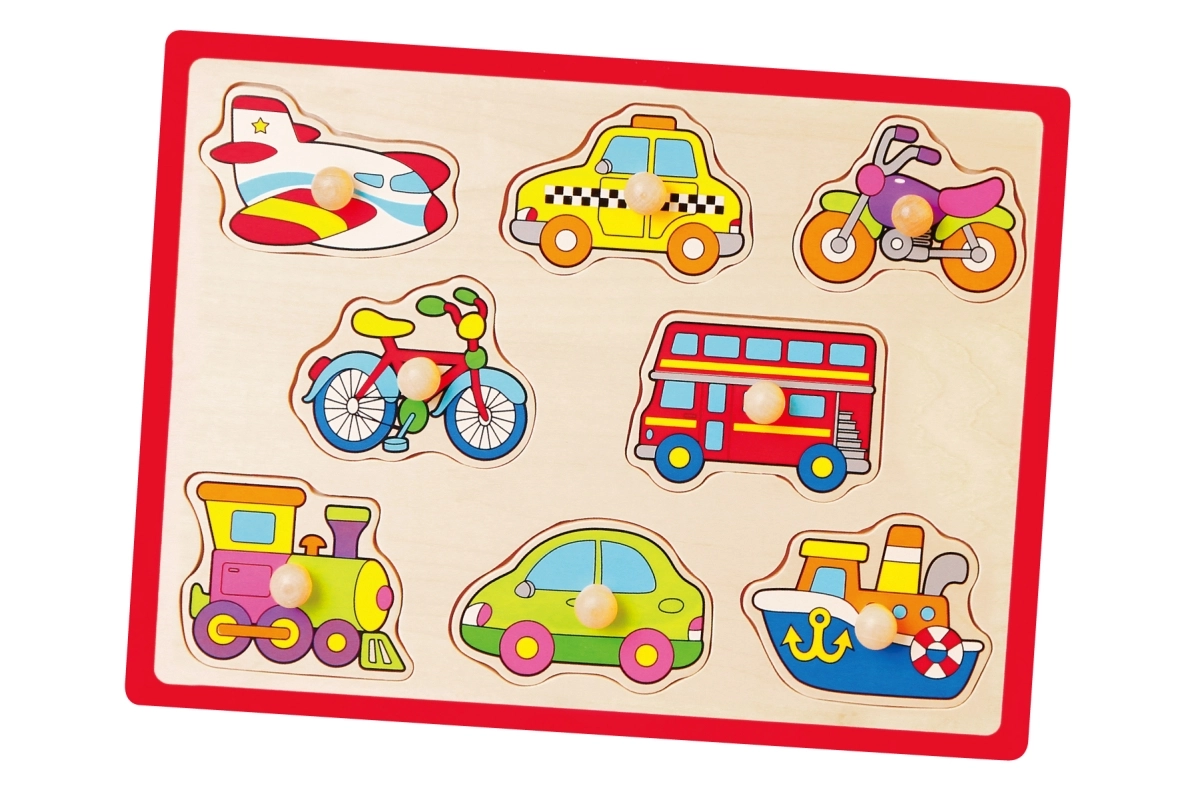 Kleurige houten inlegpuzzel met vervoersmiddelen die de fijne motoriek, oog-handcoördinatie en vormherkenning stimuleert. Dankzij de houten knopjes zijn de stukjes ook voor de allerkleinsten gemakkelijk vast te pakken. Ideale educatieve speelset voor kinderen vanaf 18 maanden.