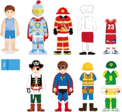 Kleed het figuurtje aan in verschillende rollen – piraat, sporter, ridder of superheld. Kinderen oefenen oog-handcoördinatie en creativiteit bij het samenstellen van hun eigen outfits.