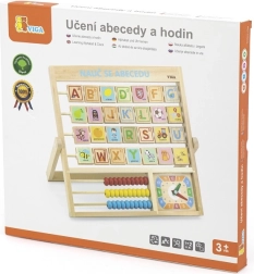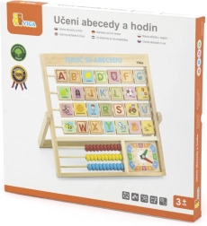 Houten alfabet en klok in het Tsjechisch. Kinderen kunnen letters en cijfers leren en een algemeen begrip van de klok ontwikkelen. Op de achterkant van elke letter staat een woord voor betere memorisatie. Afmetingen ca. 32,5 x 32 x 2,3 cm. Verpakkingsafmetingen ca. 34 x 32,5 x 3 cm. Leeftijd 3+