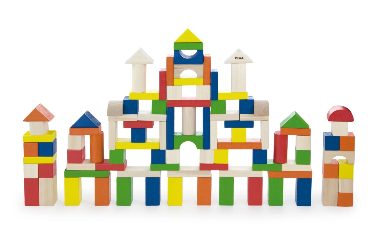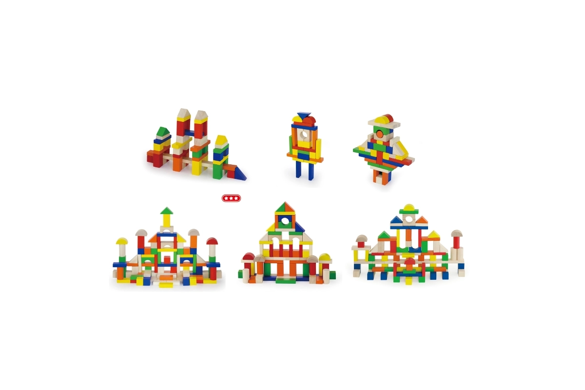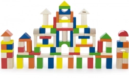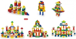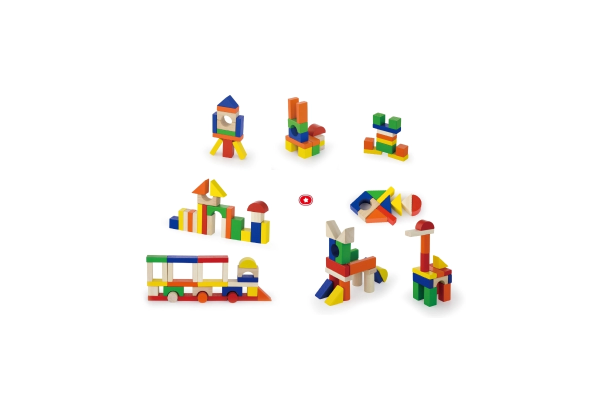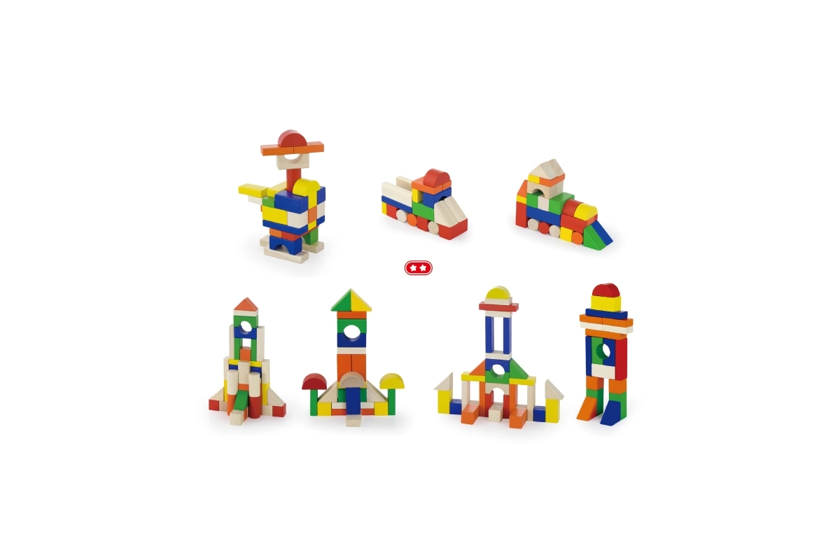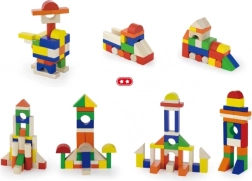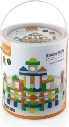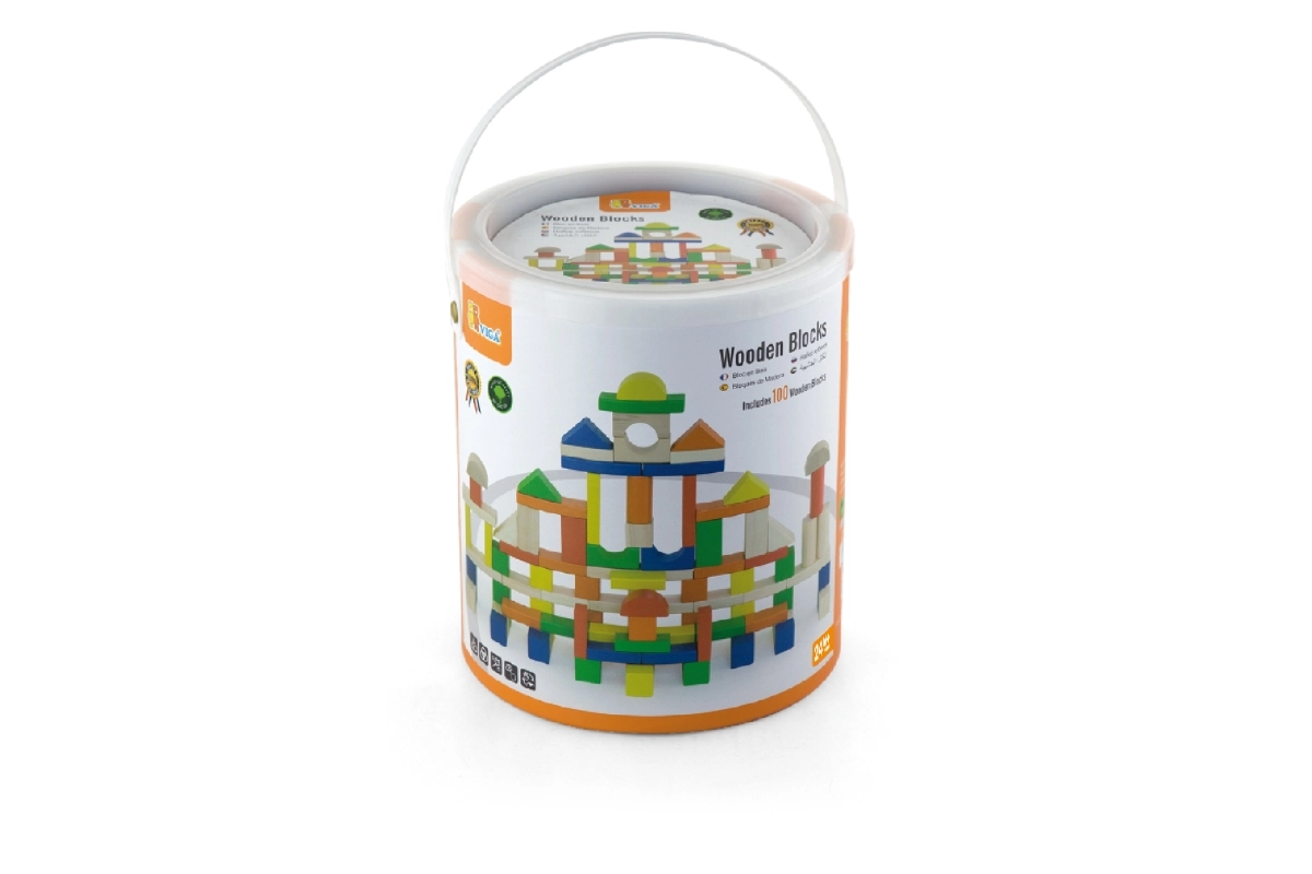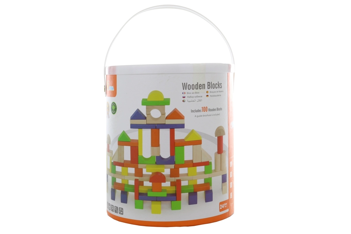 Houten bouwset in een emmer. Bevat 100 stukjes en een geïllustreerde brochure met bouwinstructies. Afmetingen van de verpakking ca. 18 x 21 cm. Formaat van de blokken 2,5 - 7,5 cm afhankelijk van het type. Leeftijd 2+