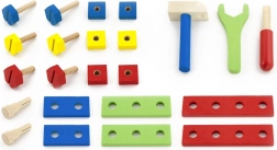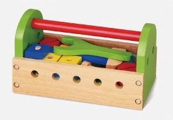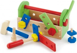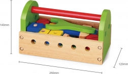 Leuke en veilige houten gereedschapsset voor kleine klusjesmannen vanaf 3 jaar in een praktische draagkist. Bevat een schroevendraaier, hamer, steeksleutel en kleurrijke schroeven, moeren en plankjes om te schroeven. Ondersteunt fijne motoriek, coördinatie en fantasie dankzij de hoogwaardige houten afwerking.