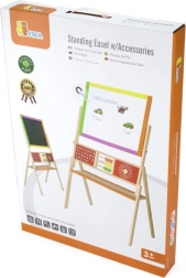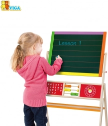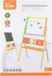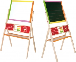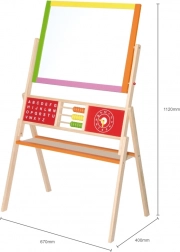 Dit veelzijdige houten bord is ideaal voor kinderen vanaf drie jaar dankzij zijn vele functionaliteiten. Het biedt een magnetisch oppervlak geschikt voor stiften zonder drukpunt en een krijtbord voor traditioneel schrijven en tekenen. Het bord omvat ook leuke en educatieve elementen: