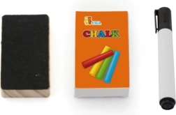 De verpakking bevat alle benodigde hulpmiddelen, inclusief krijt, stift en spons voor eenvoudig wissen.