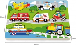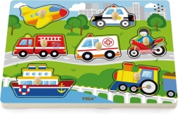 De puzzel bevat de volgende vervoermiddelen: vliegtuig, auto, ambulance, boot, brandweerwagen, motorfiets en helikopter. De opmerkzaamheid en het geheugen van kinderen verbeteren snel tijdens het spelen. Aanbevolen voor kinderen vanaf 18 maanden.