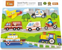Houten geluidspuzzel met het thema vervoermiddelen van het merk Viga. Elke puzzelstuk laat een kenmerkend geluid horen wanneer deze op de juiste plek wordt geplaatst. Ideaal voor kinderen vanaf 18 maanden.