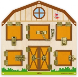 Deze kwalitatieve houten speelset in de vorm van een huisje biedt meerdere deurtjes met uiteenlopende types sloten – haakjes, grendels, kettinkjes en schuifgrendels. Bij elke opening wacht een verrassing in de vorm van geïllustreerde dieren, wat nieuwsgierigheid, concentratie en oog-handcoördinatie stimuleert.
