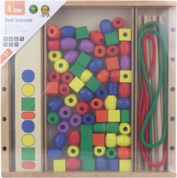 Kinderen stapelen en rijgen kralen op stokjes in de volgorde die door de kaarten wordt aangegeven. Ze oefenen oog–handcoördinatie, geduld en het herkennen van kleuren en vormen.