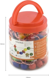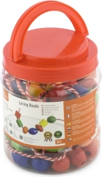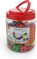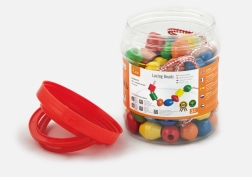 De plastic doos bevat grote houten kralen en gekleurde veters waarop de kralen geregen kunnen worden. Afmeting van de kraal ca. 2 x 2 cm, afhankelijk van het type. Afmetingen van de verpakking ca. 16 x 12 cm. Bevat 90 kralen en 5 koorden. Leeftijd 3+.
