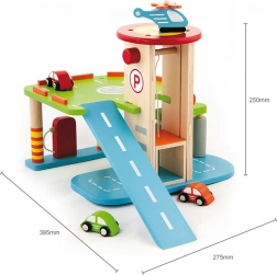 Deze kwaliteitsvolle houten garage biedt meerdere parkeerlagen, een landingsplatform voor de helikopter en een praktische lift om autootjes gemakkelijk tussen verdiepingen te verplaatsen. Dankzij het doordachte ontwerp met banen, borden en accessoires oefenen kinderen hun coördinatie en ontwikkelen ze hun verbeelding.