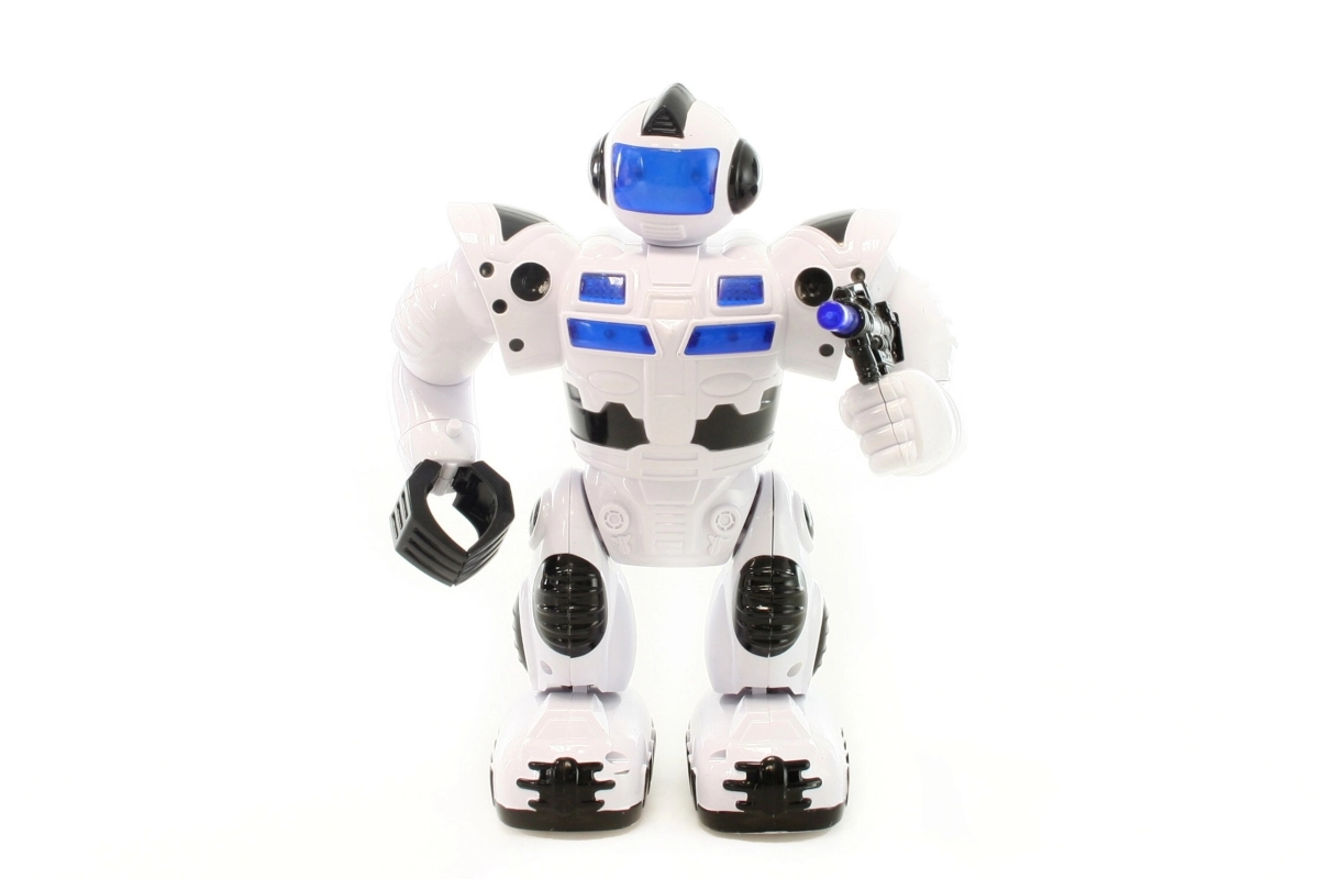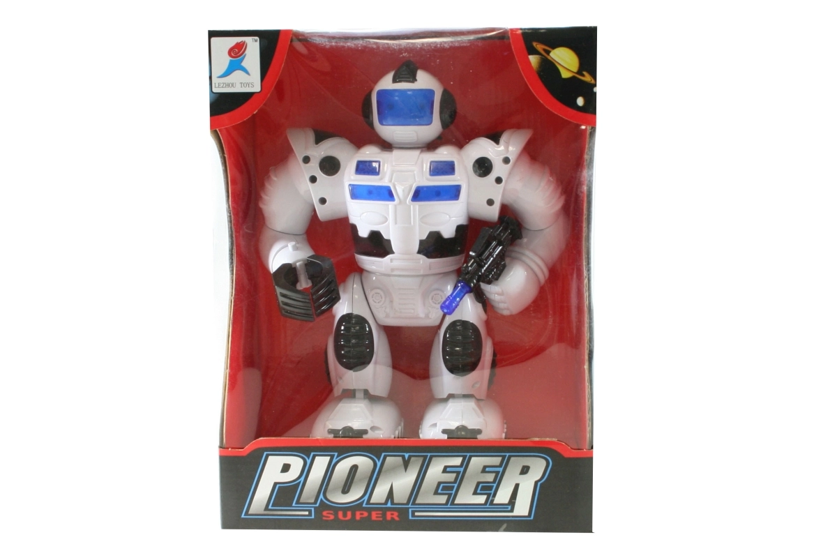 Robot op batterijen die loopt, licht geeft en geluiden maakt, en zijn armen en hoofd beweegt. Werkt op 4x AA-batterijen (niet inbegrepen). Afmetingen van de robot ca. 23 x 17 cm. Leeftijd 3+
