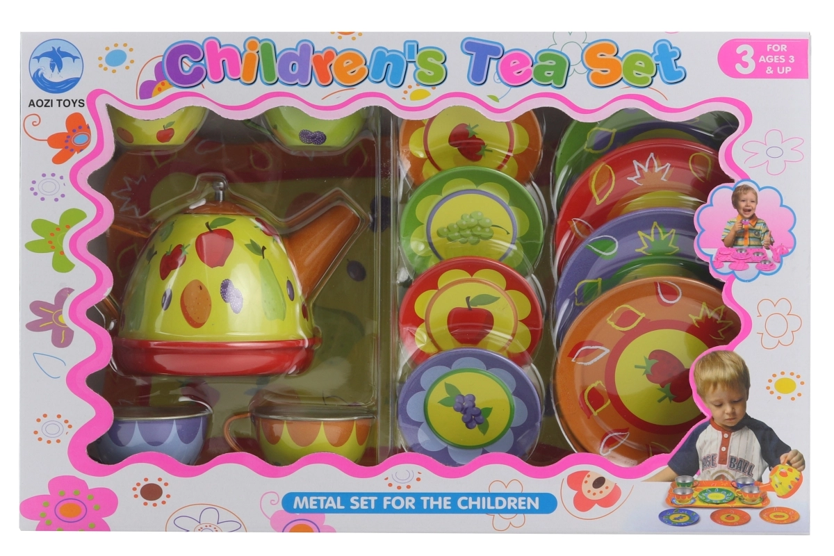 Het theeservies bevat: 1x theepot ca. 11 cm, 4x kopje met schoteltje, 4x bordje en 1x dienblad. Afmetingen verpakking ca. 32 x 20 x 9,5 cm. Leeftijd 3+