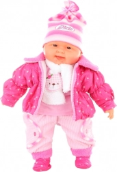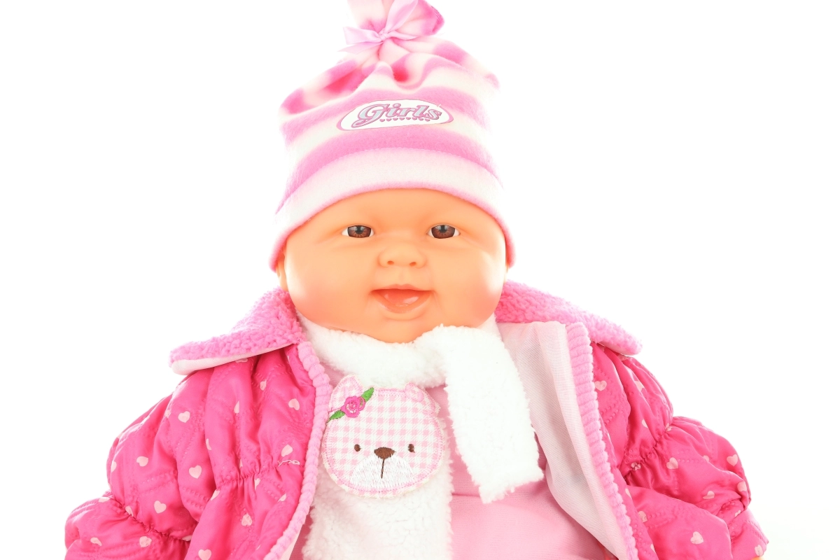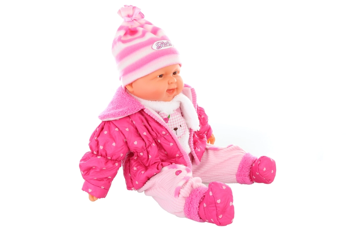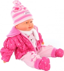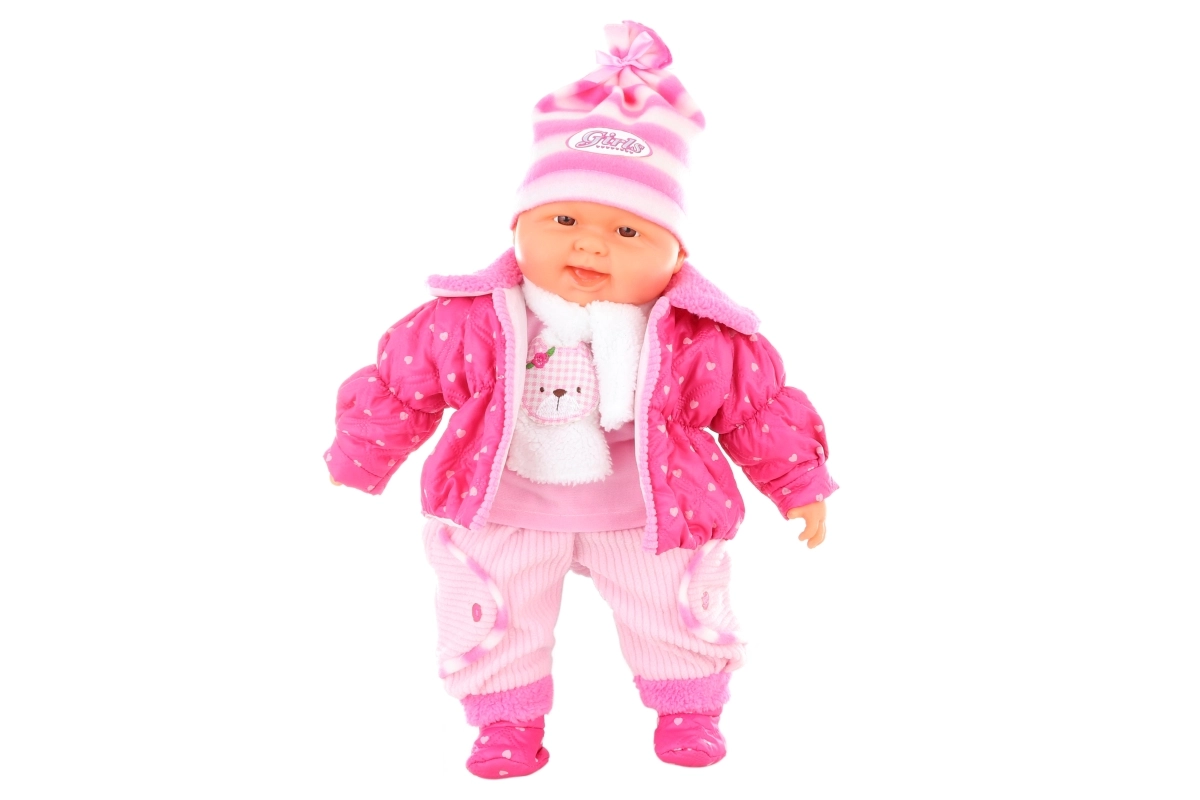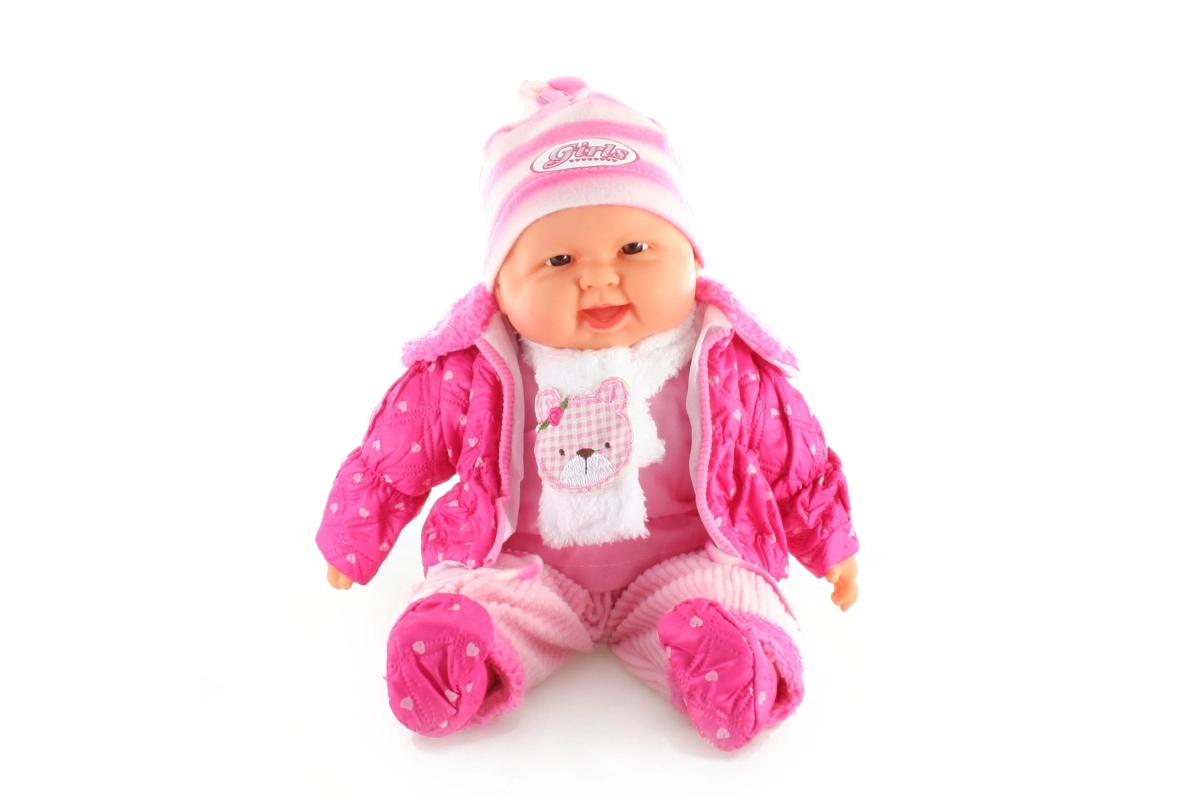 De pop heeft een gedetailleerd gezichtje en kleding van kwaliteitsstof in roze tinten, geschikt voor dagelijks spel en als cadeau. Afmeting ca. 52 × 30 × 13 cm voor prettig vasthouden, ook voor kleinere kinderhanden.