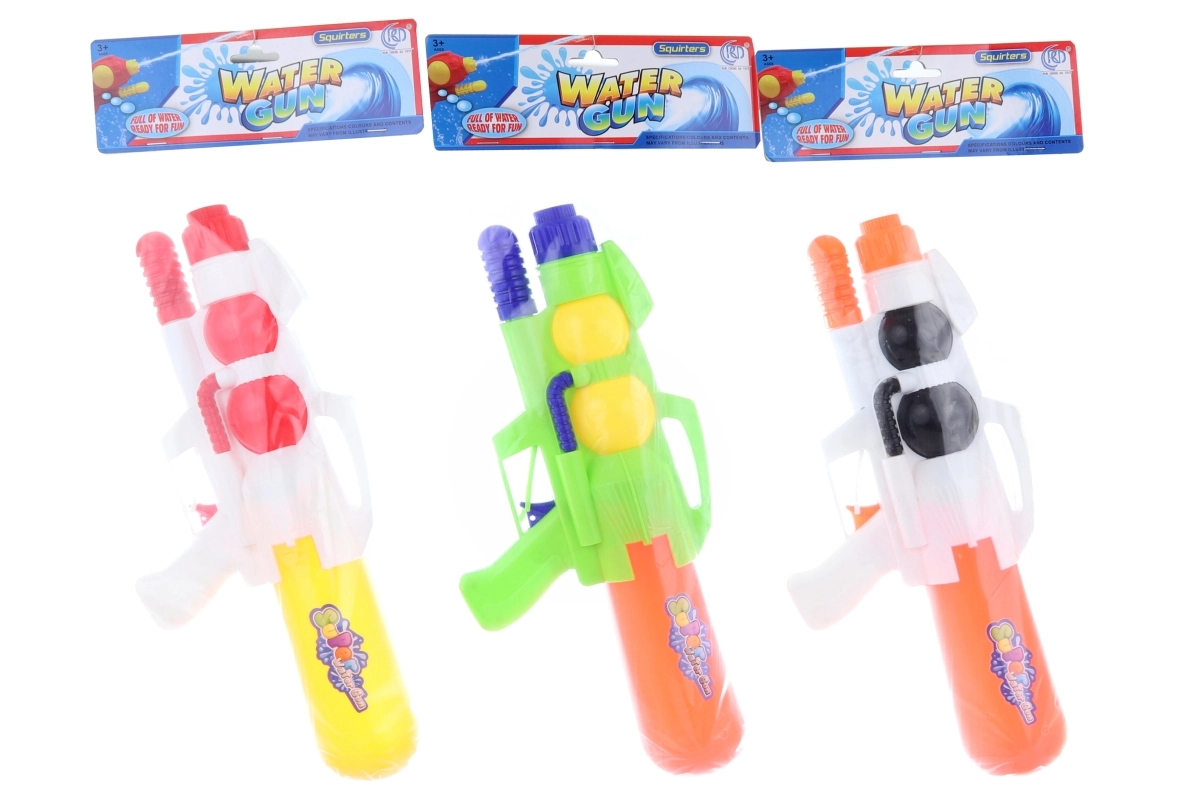 Kunststof waterpistool met afmetingen ca. 35 x 17 x 6,5 cm. Afmetingen van de verpakking ca. 20 x 48 x 6,5 cm. Leeftijd 3+