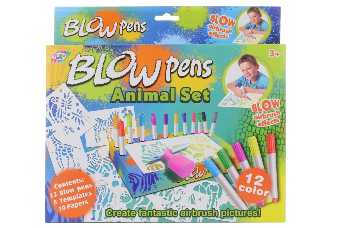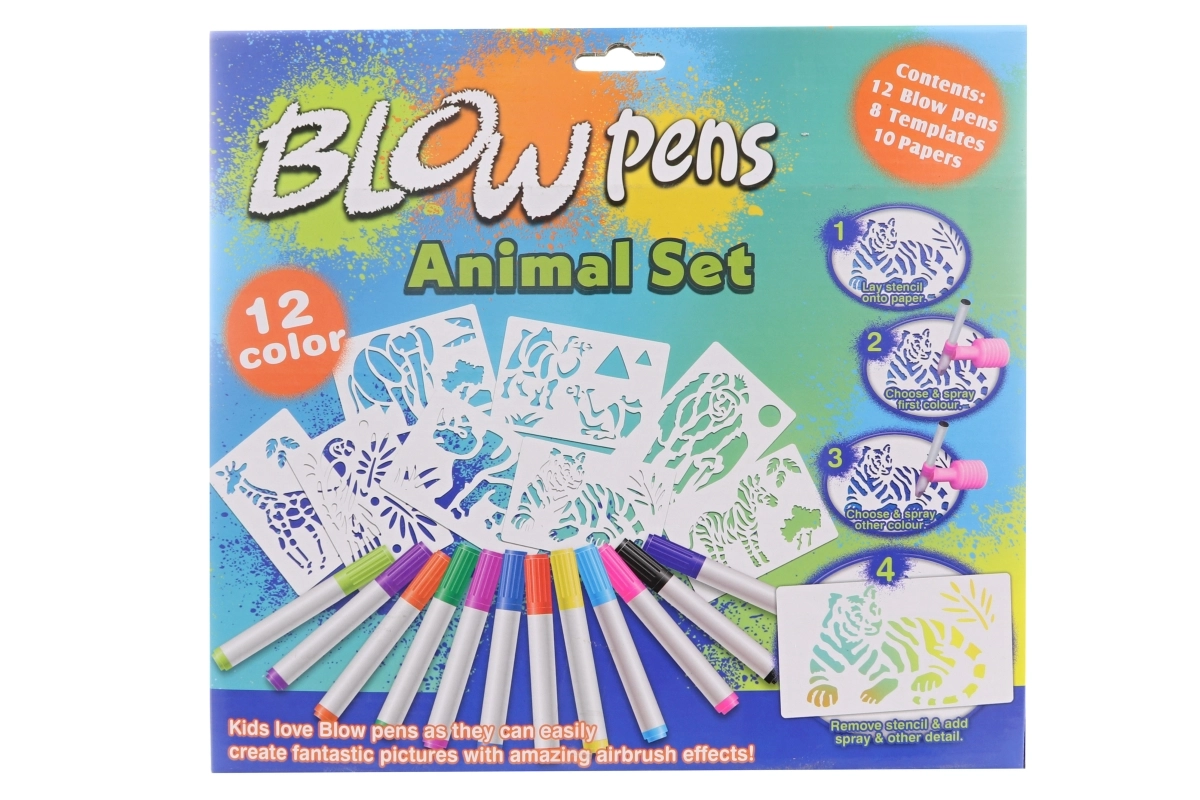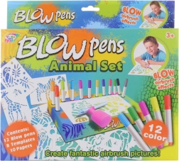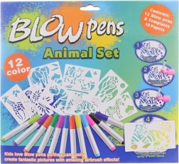 Met deze grote set blaasstiften maken kinderen gemakkelijk originele afbeeldingen met safari-dieren. Dankzij het opzetstuk met pompje is geen sterke adem nodig – de kleur wordt als een zachte straal aangebracht en creëert mooie overgangen en schaduwen. De praktische standaard met houder houdt de stiften overzichtelijk bij elkaar.