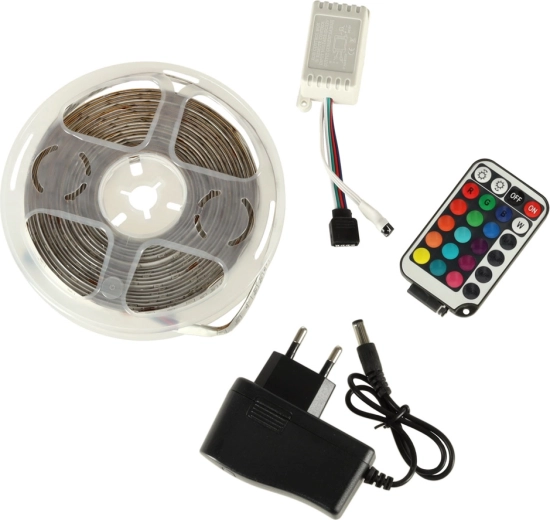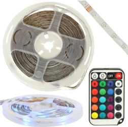 Waterdichte RGB-LED-strip met witte kleur en afstandsbediening is ideaal voor decoratieve verlichting van interieurs. Dankzij de hogere helderheid en de mogelijkheid tot kleurenverandering biedt het veel toepassingsmogelijkheden.