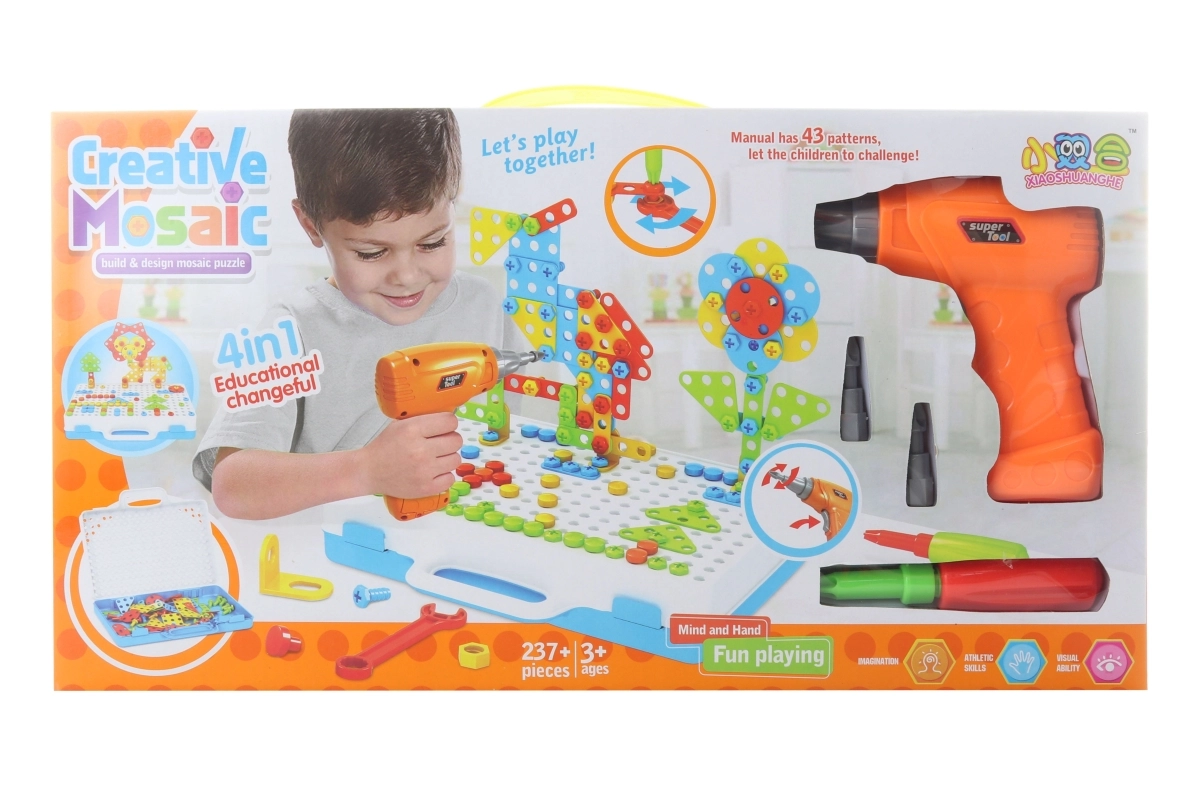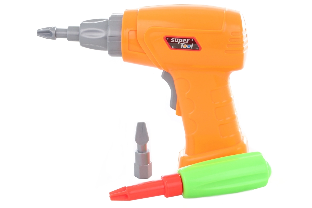 Actief schroeven met de oranje boor en verwisselbare bits bevordert coördinatie en versterkt de vingers. Voeding: 2× AA-batterijen (niet inbegrepen).