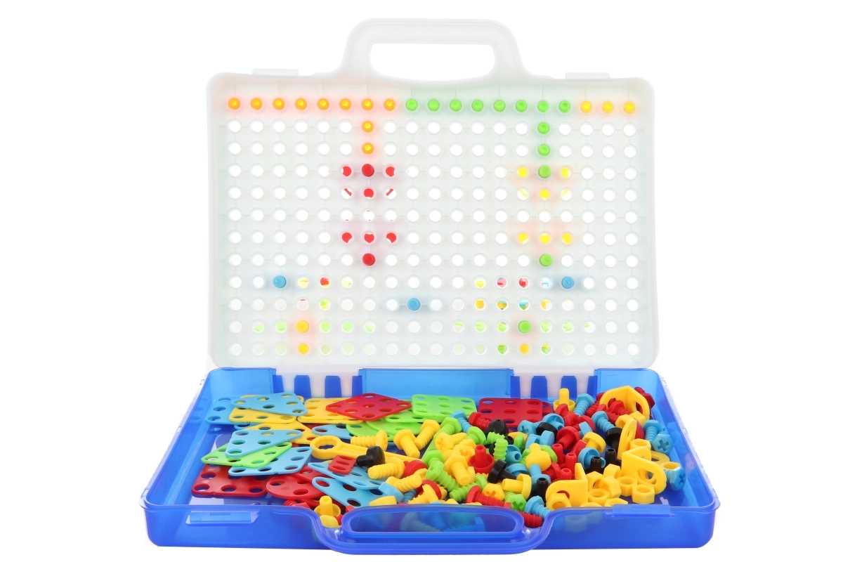 Alles is opgeborgen in een draagbare koffer met een deksel dat fungeert als pegboard, waardoor de set makkelijk te dragen en op te ruimen is. Een geweldige hulp voor de ontwikkeling van motoriek, oog-handcoördinatie, creativiteit en geduld.