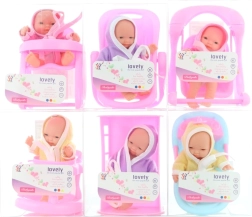 Schattige baby met diverse accessoires voor creatief spel. Elke baby heeft zijn eigen item (stoeltje, badje, bedje, loopstoeltje e.d.) en een outfit, ideaal voor kleine verzorgers. Compact formaat van ca. 10 cm past perfect in kinderhandjes. Geschikt voor kinderen vanaf 3 jaar.