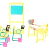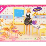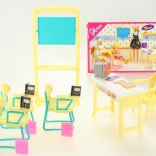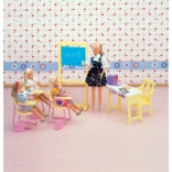De set bevat een ruim schoolbord, een lerarenhoek met computer en stoelen voor leerlingen. Dankzij de compacte afmetingen is de set compatibel met gangbare poppen en eenvoudig op te bergen.